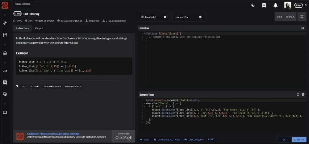 Anglicky psaný zdroj s možností procvičit si hravou formou několik desítek programovacích jazyků, včetně JavaScriptu, Pythonu a dalších. Na stránkách si uživatelé zlepšují svou úroveň (obecně i v jednotlivých dostupných programovacích jazycích) řešením různých úkolů. Čím vyšší úroveň, tím těžší úkoly.