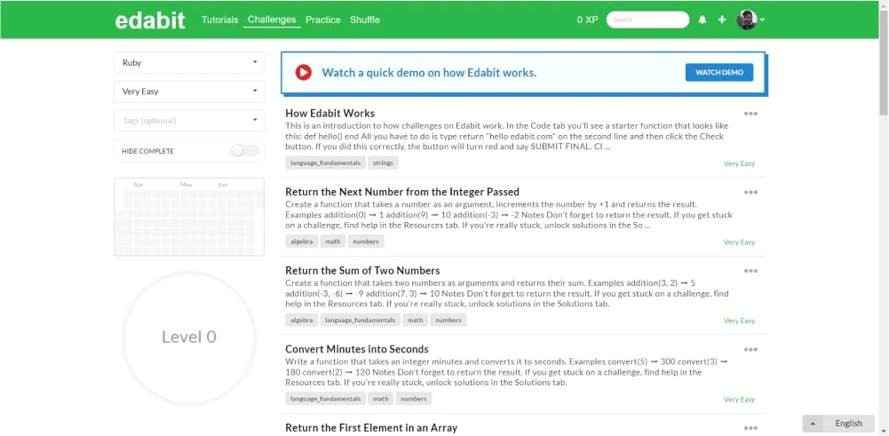Webová stránka pro procvičování programování s víc než 10 000 úkolů a maskotem, který se může rovnat charismatu sovy Duolingo. Edabit se prezentuje jako Duolingo pro výuku programování.