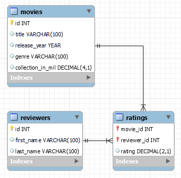Všimni si také, že v tabulce ratings jsou sloupce movie_id a reviewer_id, které jsou vnějšími klíči, deklarovány jako primární klíče. To zabraňuje tomu, aby jedna osoba přiřadila hodnocení stejnému filmu dvakrát.