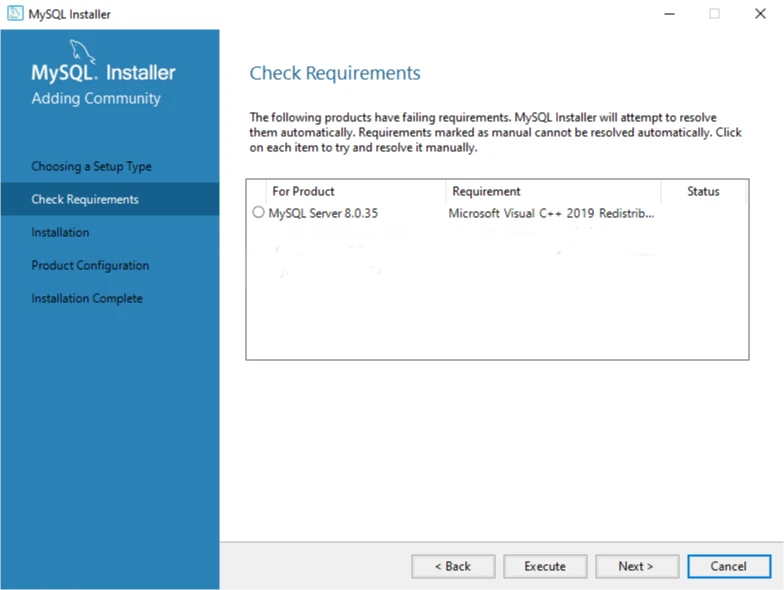 Pokud nemáš nainstalovaný balíček Microsoft Visual C++ 2019 Redistributable Package, který je nezbytnou podmínkou pro MySQL Server 8.0, otevře se stránka Check requirements a vyzve tě k instalaci nové kompatibilní verze balíčku. Kliknutím na tlačítko Execute (Spustit) jej nainstaluj: