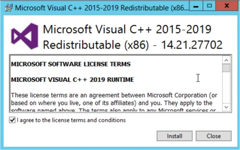 Otevře se okno instalace balíčku Microsoft Visual C++ 2015-2019 Redistributable Package. Přijmi licenční podmínky a klikni na tlačítko Install: