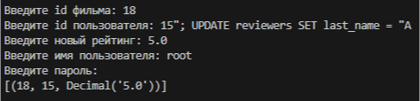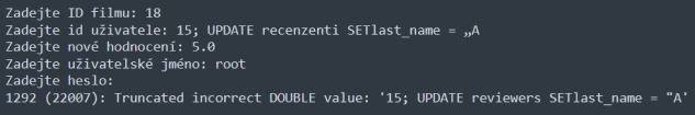Hodnoty rating pro movie_id=18 a reviewer_id=15 byly změněny na 5,0. Pokud bys však byl*a hacker*ka, mohl*a bys zadat skrytý příkaz: