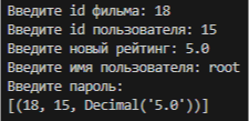 Pokud například uživatel zadá movie_id=18, reviewer_id=15 a rating=5,0, bude výstup vypadat následovně: